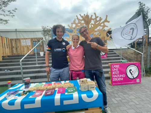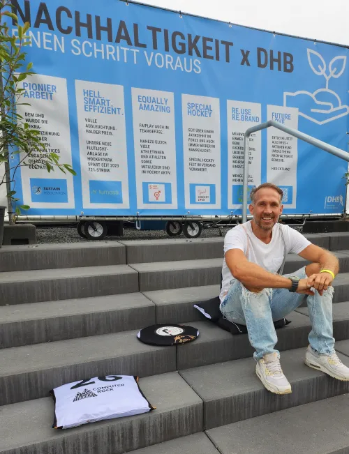 Beides hat der Verband nun beim Großevent Europameisterschaft präsentiert und konnte damit eine gute Plattform für das Thema schaffen. Am Eingang des Stadions standen den Besucher*innen und Fans sowohl Infos zum Lesen zur Verfügung, als auch kleine aktive Spiele, die sich entweder um das Thema Nachhaltigkeit drehten oder über das Upcycling von Hockeymaterial hergtellt wurden. Und im Zusammenhang die den 8 Sustainable Development Goals (SDGs), zu denen sich der DHB bekennt, wurden Umsetzungsbeispiele aus den Hockeyvereinen präsentiert, um das Thema greifbarer zu machen. An den letzten drei EM-Tagen bekam der DHB dann noch Verstärkung von Vertretern der Initiative "Hockey gegen Rassismus". Ein Statement, welches aus der Feder des Vereins Real von Chamisso aus Berlin stammt und sich bereits seit einiger Zeit schon bei Hockeyveranstaltungen zeigt.