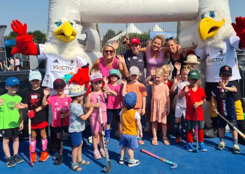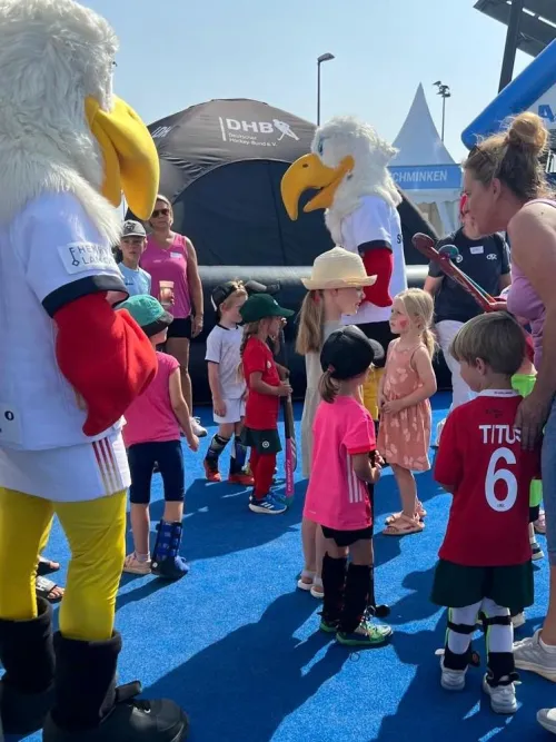 Im Vorlauf zur EM hatte man Mönchengladbacher Kitas sowie weitere Einrichtungen im nahen Umfeld zu einem kleinen Hockeyturnier eingeladen, um zu zeigen, dass Hockey im Mixed-Modus auch schon von den ganz Kleinen gespielt werden kann. Und wie! Es wurde gedribbelt, gerannt und gejubelt. Sogar die Hockey-Maskottchen Schlenzi und Aggi wurden auf das agile Hockeygewusel aufmerksam und schauten beim Mini-Hockey-Stars Turnier vorbei. Und am Ende gab es für jedes Kind eine Urkunde und weitere Kleinigkeiten als Erinnerung an einen tollen Hockeyvormittag bei der EM 2025.