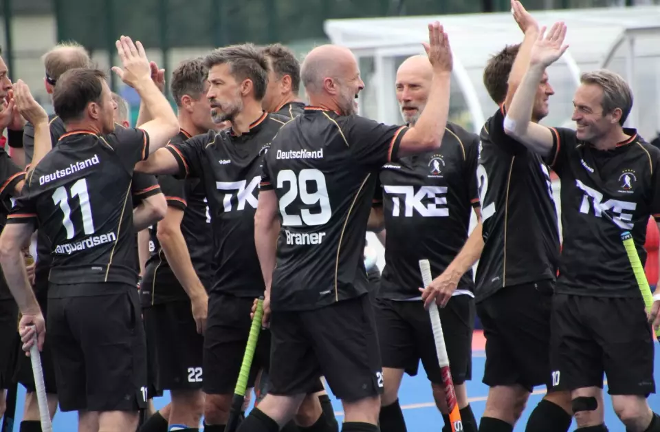 Gerome Wiedelbach, Lennart Clasen und Bastian Lueken belohnen sich bei der EM in Nottingham mit ihren ersten Treffern im letzten Vorrundenspiel gegen Italien, das von englischem Sommerwetter mit starken Böen, Regen und Sonnenschein geprägt war. „Für uns war das Ergebnis zweitrangig. Wir wollten taktisch konzentriert spielen, auf die gemeinsame Linie achten und die Abstimmung untereinander trainieren“, fasst Mannschaftskapitän Martin Klönne nach dem hohen 14:0-Sieg über die Italiener zusammen, die mit nur 12 Spielern antraten. Bereits nach zwei Minuten überwindet Hinrich Nolte nach schönem Zusammenspiel mit Christian Remmers den italienischen Goalkeeper, dessen Abwehr sich per Kurzpässen aus dem Pressing zu lösen sucht. Nachdem Bastian Lueken in der 17.Minute goldrichtig steht und seinen ersten von zwei Masters-Treffern erzielt, färbt der englische Sommerregen den Himmel grau-weiß ein. Gerome Wiedelbach und Lennart Clasen folgen dem Beispiel und tragen sich erfolgreich in die Torschützenliste ein. Im Verlauf erhöht die M50 den Druck und kommt so zu weiteren Strafecken und Torchancen, die zum Halbzeitstand von 8:0 führen. Gelungene Spielverlagerungen im Mittelfeld über den überall zu findenden Steffen Bunzel tragen dazu bei, dass die vorgerückten Außenverteidiger Gunther Deinl und Andreas Hatz lange Bälle ins italienische Viertel spielen können, die von Lars Brenneke und Stefan Braner zu gefährlichen Kreisszenen verarbeitet werden. Immer wieder prüfen die deutschen Stürmer den italienischen Goalkeeper, der sich wacker schlägt, aber den Endstand von 14:0 nicht verhindern kann. Im Viertelfinale wartet mit Schottland eine fordernde Aufgabe auf die M50.