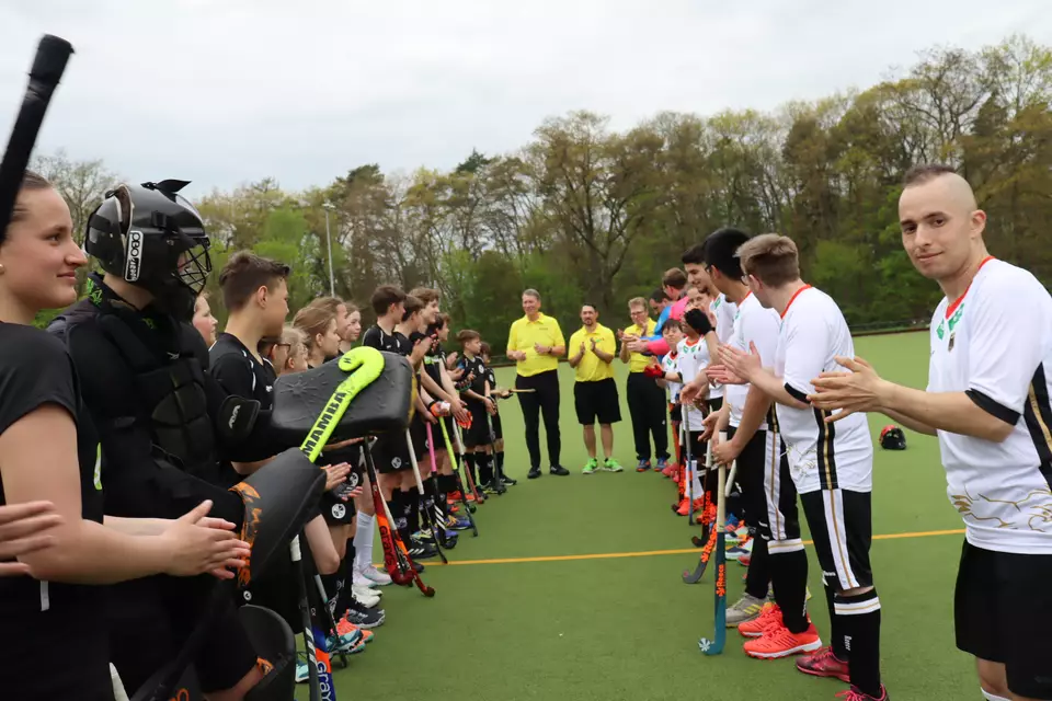 Und so wenig HONAMAS & DANAS auf Lehrgängen ausschlafen können, so wenig können es auch die Special-Hockies. Bereits um 7:30 Uhr begann der Tag mit einer gymnastischen Morgenaktivierung, denn am Samstag standen zwei Testspiele an: eines gegen eine gemischte Jungs- und Mädchenmannschaft des HTC Troisdorf und eines gegen die mU14 vom HTC SW Bonn. Die Spiele endeten 8:8 und 1:5, aber viel wichtiger als die Ergebnisse waren die Erlebnisse. Entsprechend gut drauf war die Mannschaft, so dass die Bettruhe um 22 Uhr für Einige viel zu früh kam. Ausreichender Schlaf sollte allerdings wichtig sein, denn die Trainer*innen nahmen am nächsten Tag keine Rücksicht auf schwere Beine und setzten noch mal eine knackige Trainingseinheit an. Denn darin sind sich alle einig: nur so wird es etwas mit dem erhofften Medaillengewinn bei der Heim-Europameisterschaft!