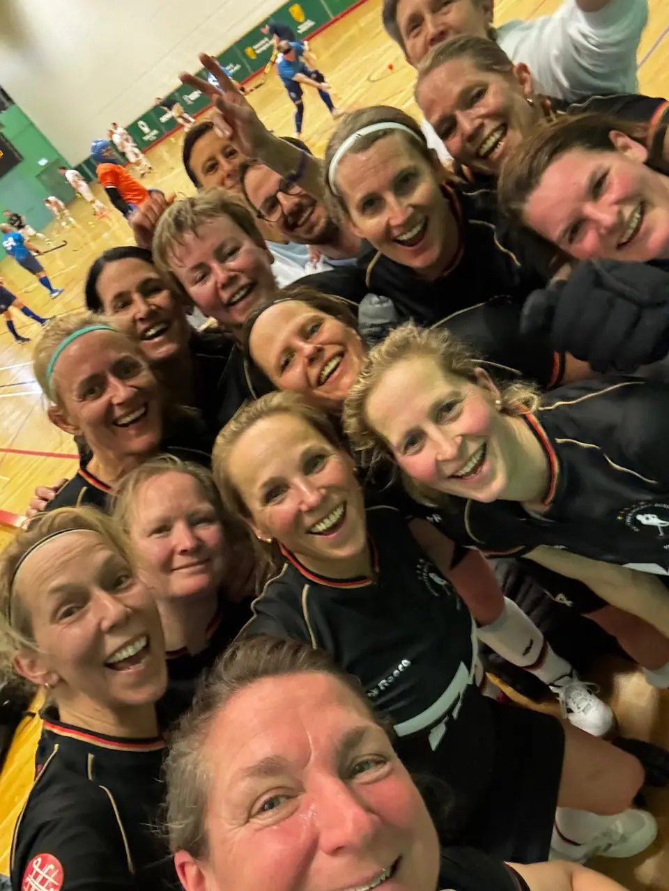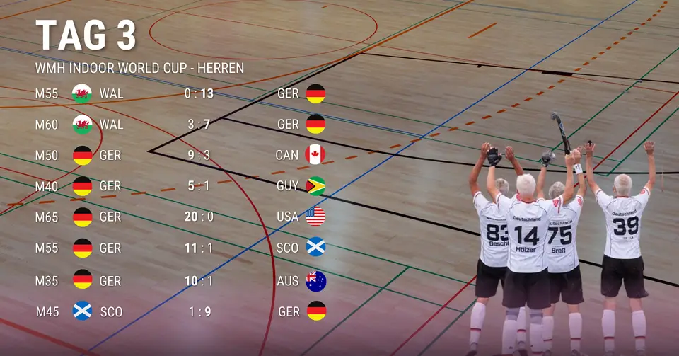 Die M55 setzt ein weiteres Ausrufezeichen. Gegen den amtierenden Vizeweltmeister Wales ging man schon in der ersten Minute in Führung und kontaktete sich bis zur Halbzeit auf 6:0 hoch. Auch wenn die Waliser der bis dahin stärkste und strukturierteste Gegner waren, ließen die Deutschen keine Fehler zu und siegten nach 40 Minuten souverän mit 13:0. Sechs Stunden später dann das letzte Gruppenspiel gegen Schottland. Trotz der Devise „kein Risiko, keine Verletzungen“ spielten die Deutschen bis zur Schlusssirene voll engagiert gegen griffige und motivierte Schotten. Auch hier der Sieg ungefährdet: 4:0 nach 8 Minuten, 6:0 zur Halbzeit, erst drei Minuten vor Schluss gelang Schottland der Ehrentreffer. Mit dem 11:1-Sieg schraubten die Deutschen ihre phänomenale Torbilanz zum Ende der Gruppenphase auf 64:2 (!) und gehen als Gruppenerster ins Halbfinale. Gegner am Montagnachmittag ist voraussichtlich England.
