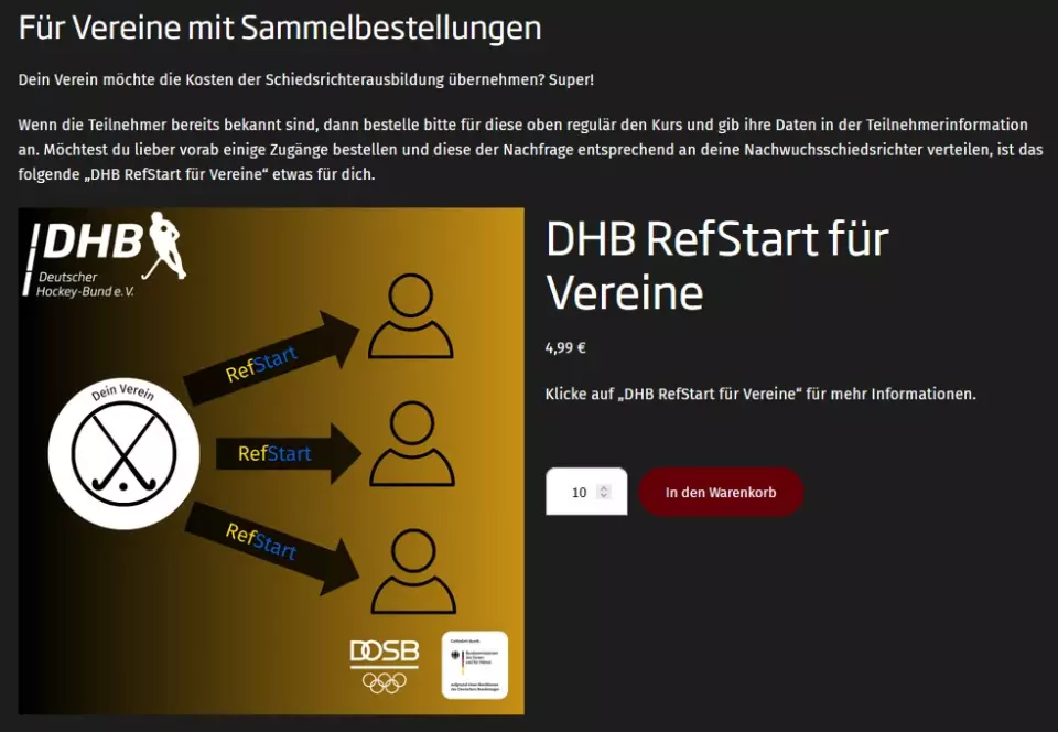 Ab sofort können alle Vereine im Shop der DHB-Akademie entsprechende Sammelbestellungen für Interessenten des RefStart-Kurses durchführen. Nach der Buchung wird ein Code zur Verfügung gestellt, den die einzelnen Vereinsmitglieder dann bei der individuellen Buchung bei der Bezahlung erfassen können.