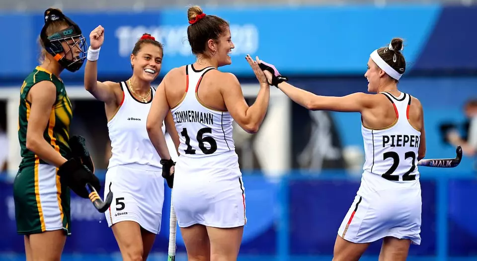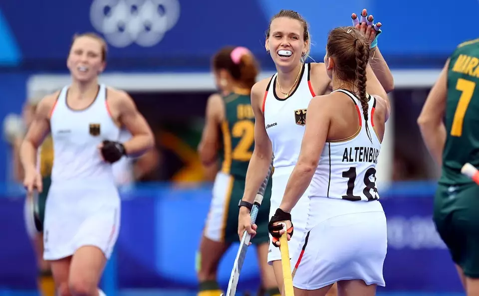 Sonntag parierte die Variante auf die Rausgeberin mit dem Schläger stark. Und kurz darauf war die deutsche Keeperin auch gegen einen Stecher von Tarryn Glasby mit toller Reaktion zur Stelle (37.). Charlotte Stapenhorst holte dann die nächste Ecke heraus, bei der Mbande schon geschlagen war, aber Celia Seerane auf der Linie gegen den Schuss von Zimmermann und den Nachschuss rettete.